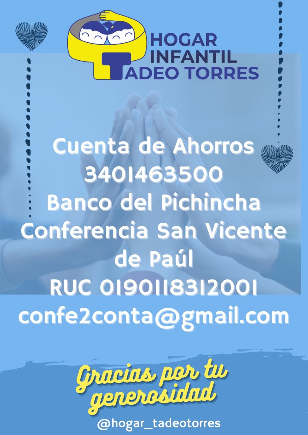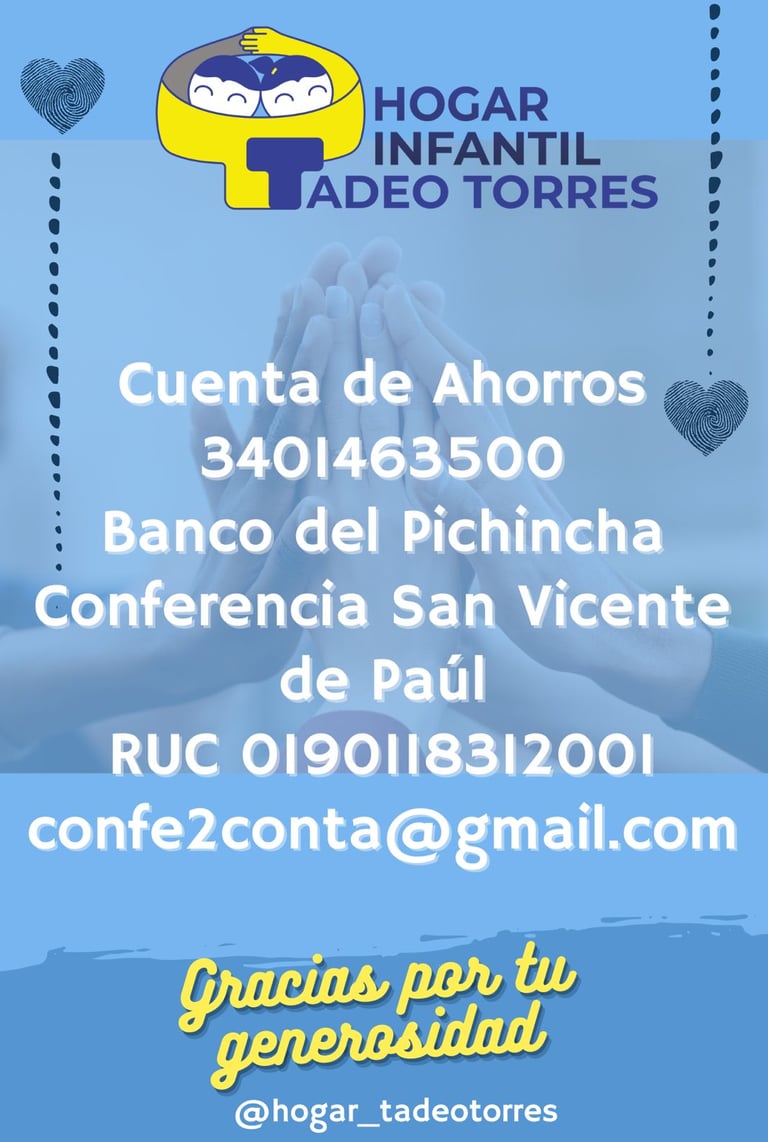 Tu apoyo puede transformar vidas. En el Hogar Infantil Tadeo Torres trabajamos cada día para brindar cuidado, protección y cariño a niños y niñas que necesitan un entorno seguro para formarse. No solo les ofrecemos alimento y un lugar donde descansar, sino que también nos enfocamos en su desarrollo emocional y psicológico, en casos de que hayan pasado por situaciones difíciles o traumáticas. Con tu donación, nos ayudas a cubrir sus necesidades diarias, acompañar su proceso de desarrollo y brindarles un futuro con más esperanza. Sé parte de esta comunidad de apoyo y ayúdanos a seguir cuidándolos.